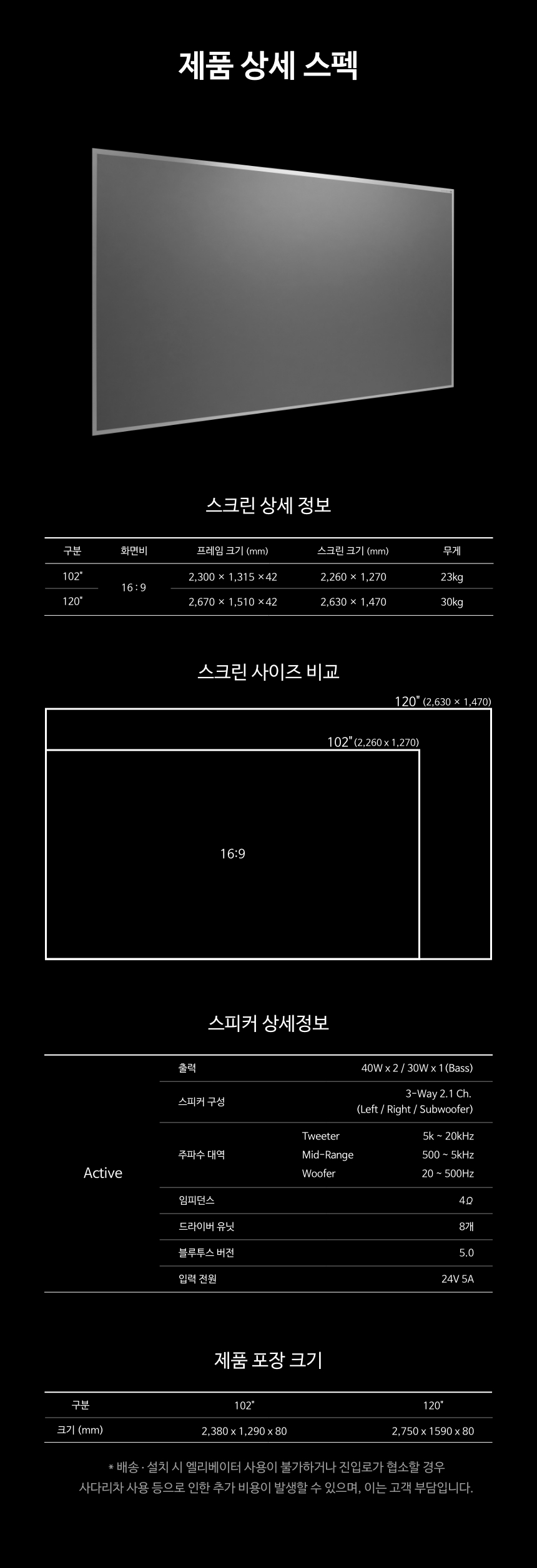 * 제품가 2,990,000원 (2,890,000원 - 쇼룸 10만원 할인 적용)* 배송비 150,000원* 설치비 120,000원* 실측비 160,000원 (120인치 가능여부 확인)총액 3,320,000원